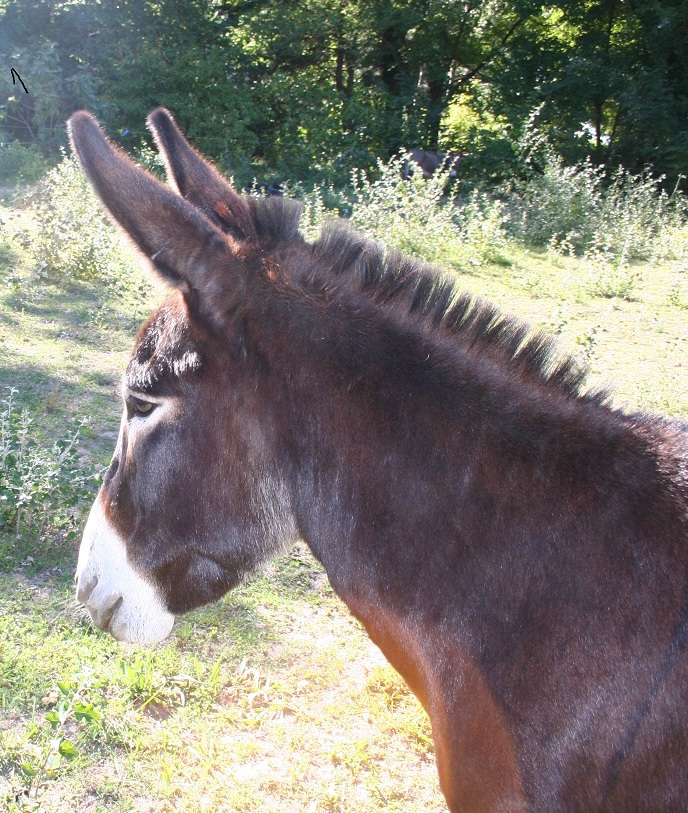 Tango, notre grand noir à la robe sombre. Né en 2005, il a été vendu par un maquignon à une personne qui souhaitait entreprendre le chemin de St Jacques de Compostelle et nous avait chargé de l’habituer à randonner. Son nouveau maître a dû renoncer à son projet car il avait peur de l’âne et la complicité n’a pas pu s’établir entre eux. Tango est resté chez nous.